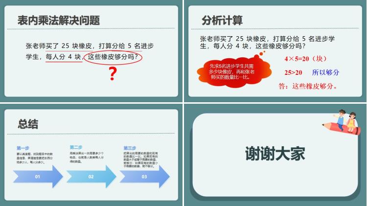大家好!我是二年级一班的众晨星,今天我和大家分享的题目是一道表内乘法解决问题,题目是这样的:张老师买了25块橡皮,打算分给5名进步学生,每人分4块,这些橡皮够分吗?