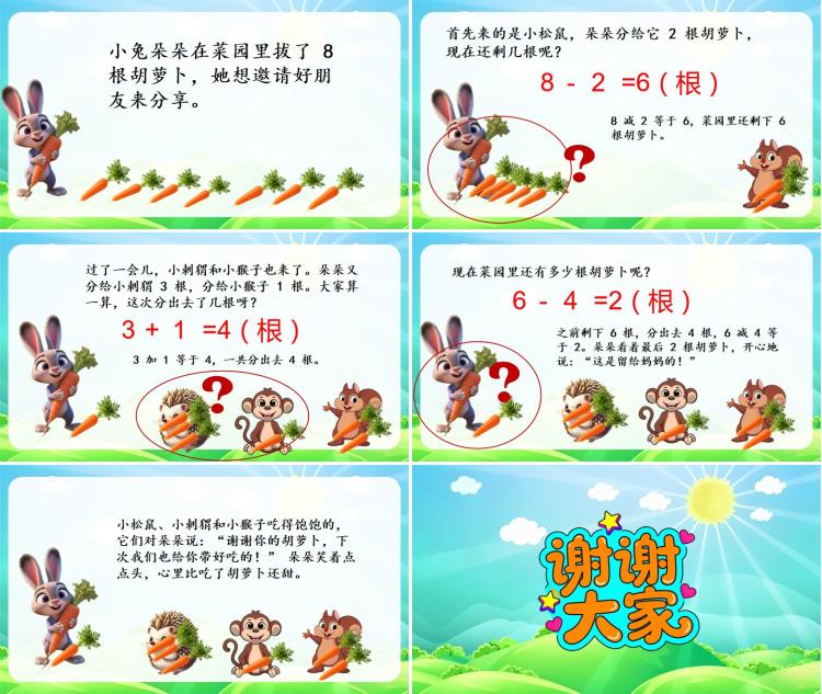 首先来的是小松鼠,朵朵分给它 2 根胡萝卜,现在还剩几根呢?8 减 2 等于 6,菜园里还剩下 6 根胡萝卜。