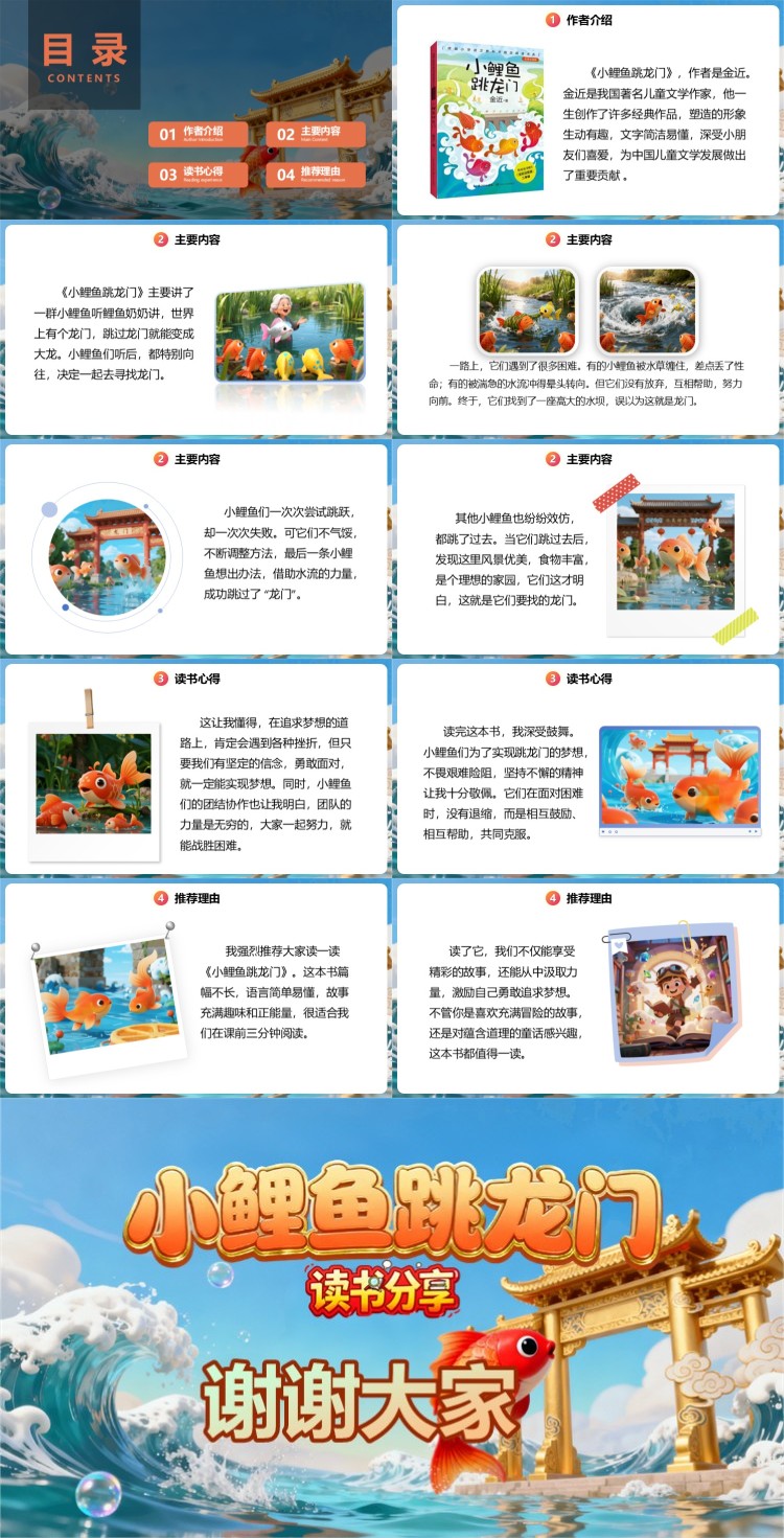 大家好!今天我要分享一本充满勇气与梦想的书 ——《小鲤鱼跳龙门》,作者是金近。金近是我国著名儿童文学作家,他一生创作了许多经典作品,塑造的形象生动有趣,文字简洁易懂,深受小朋友们喜爱,为中国儿童文学发展做出了重要贡献 。