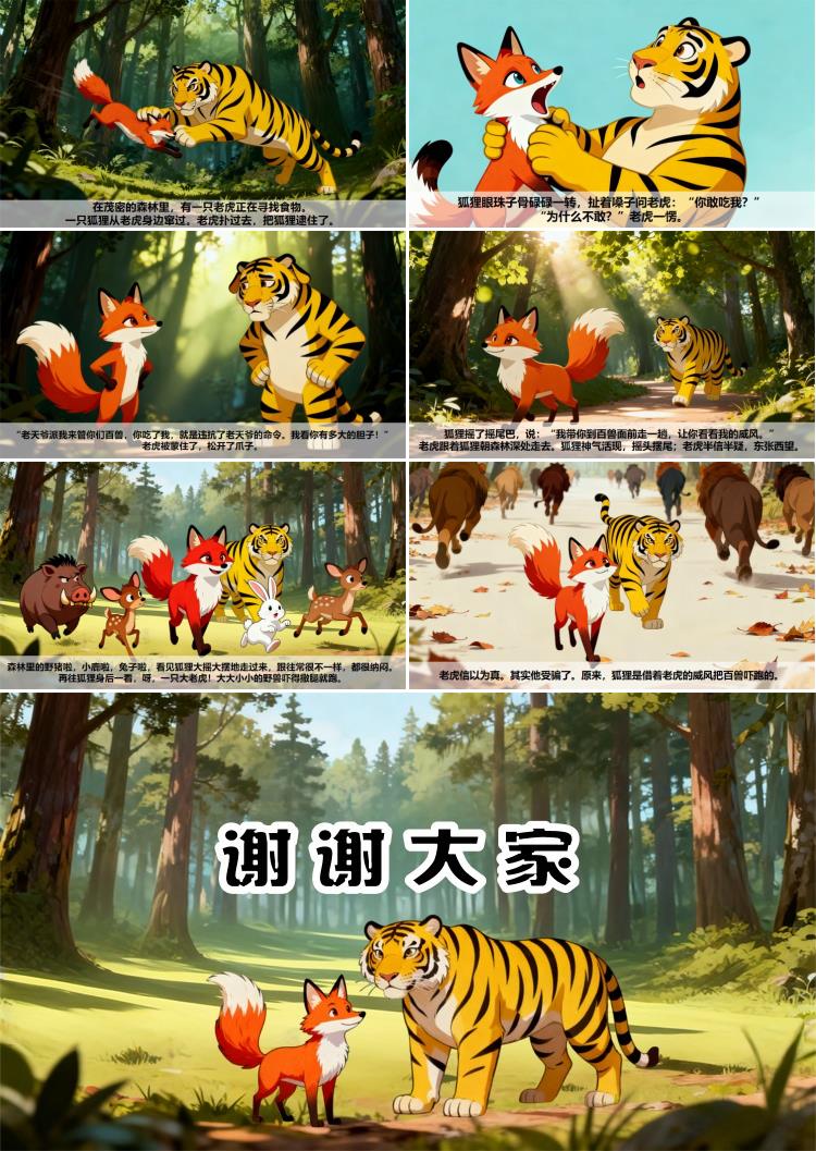 森林里的野猪啦,小鹿啦,兔子啦,看见狐狸大摇大摆地走过来,跟往常很不一样,都很纳闷。再往狐狸身后一看,呀,一只大老虎!大大小小的野兽吓得撒腿就跑。
