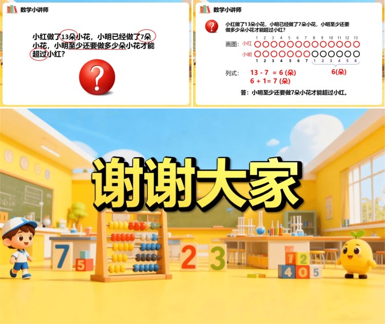大家好!我是一年级一班的方小舟。今天我给大家讲解一道数学题目。下面我们来看看这道题目:小红做了13朵小花,小明已经做了7朵小花,小明至少还要做多少朵小花才能超过小红?通过读题,我们知道了,小红做了13朵小花,小明已经做好了7朵小花,要解决的问题是:小明至少还要做多少朵小花才能超过小红。