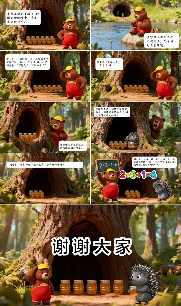 有一天,小熊回来一看,蜂蜜罐少了!它数了数,第一次少了2罐,心里还想着“可能是自己记错地方了”。结果第二天再去看,又少了3罐。这时候它才警觉起来,悄悄躲在树后观察,发现原来是小刺猬在偷蜂蜜,而且小刺猬怀里还抱着1罐没来得及带走的呢!