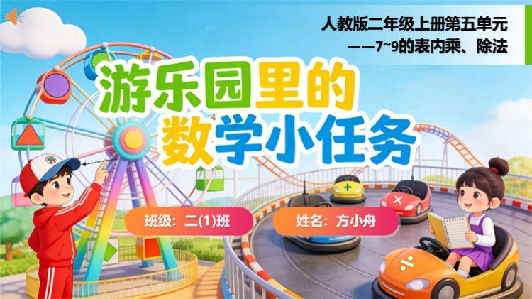 大家好!我是二(1)班的方小舟。今天,我要带大家走进游乐园,一起探索藏在那里的数学小秘密 ——7~9 表内乘、除法的应用。