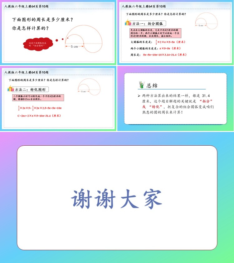 两种方法算出来的结果一样,都是 31.4 厘米,这个题目解题的关键就是 “拆分” 或 “转化”,把复杂的组合圆弧变成咱们熟悉的圆的周长来计算!