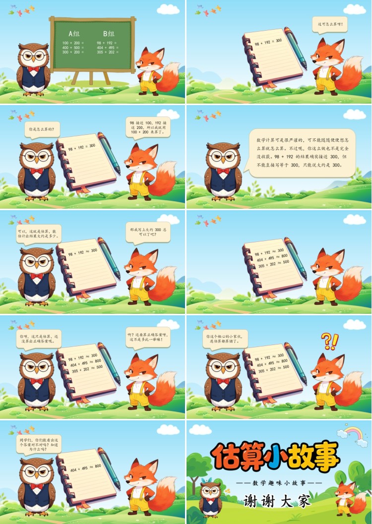小狐狸听了,眼睛一亮,连忙问道:“那我写上大约 300 总可以了吧?” 猫头鹰老师点点头说:“可以,这就是估算,能估计出结果大约是多少。”