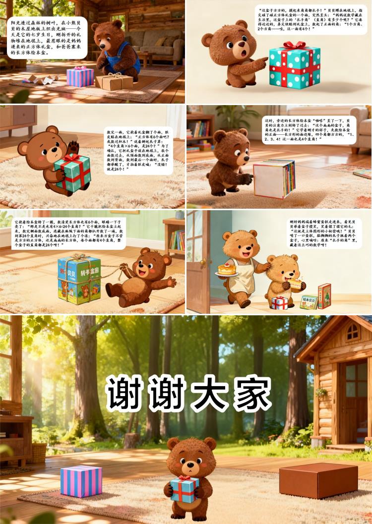 阳光透过森林的树叶,在小熊贝贝的木屋地板上织出光斑——今天是它的七岁生日,刚拆开的礼物堆在地毯上,最惹眼的是妈妈递来的正方体礼盒,和爸爸塞来的长方体绘本盒。