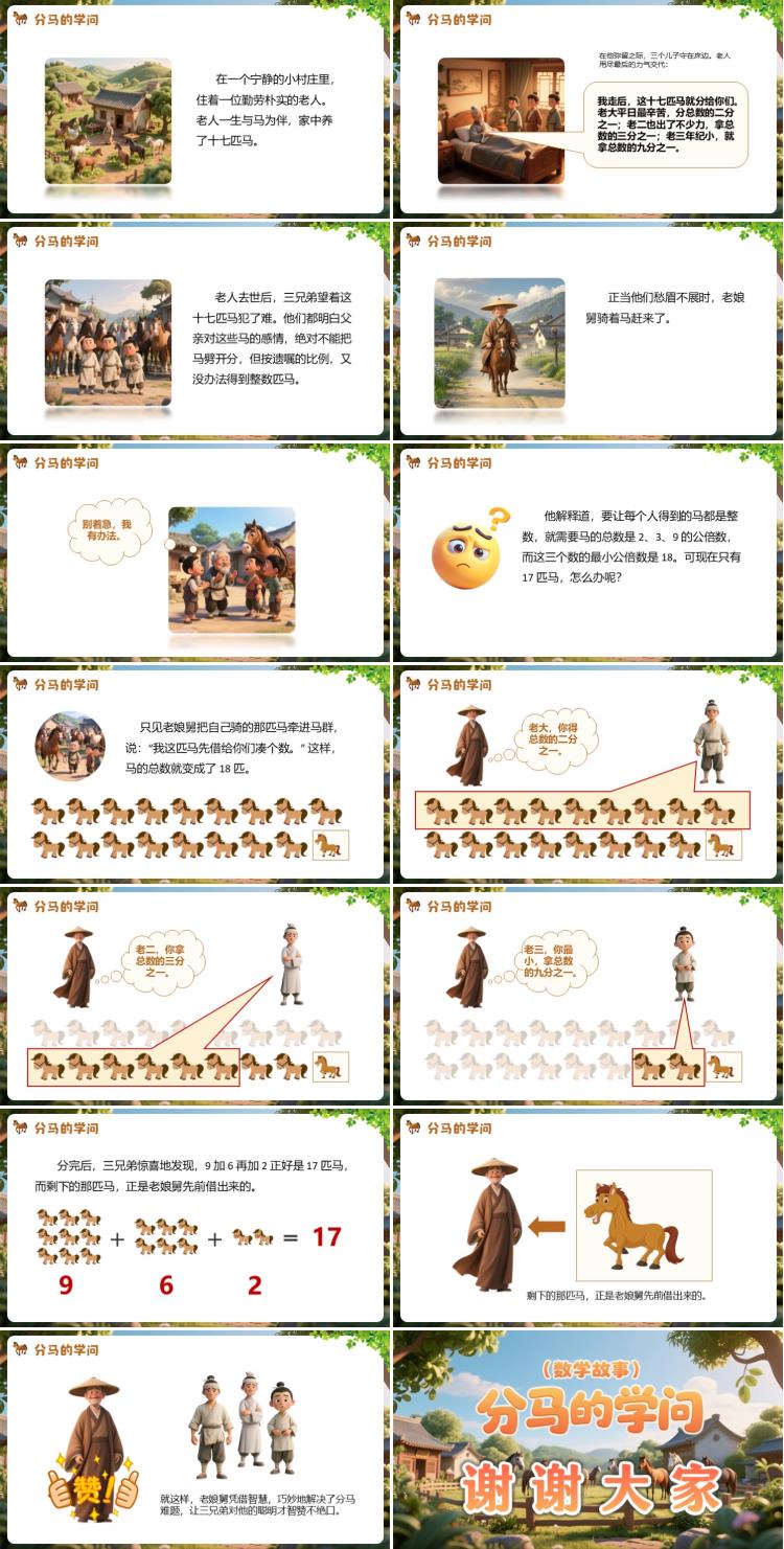 分完后,三兄弟惊喜地发现,9 加 6 再加 2 正好是 17 匹马,而剩下的那匹马,正是老娘舅先前借出来的。就这样,老娘舅凭借智慧,巧妙地解决了分马难题,让三兄弟对他的聪明才智赞不绝口。