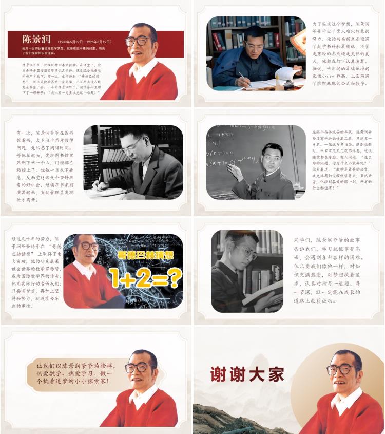 同学们,陈景润爷爷的故事告诉我们,学习就像攀登高峰,会遇到各种各样的困难。但只要我们像他一样,对知识充满热爱,对梦想执着追求,认真对待每一道题、每一节课,就一定能在成长的道路上收获成功。