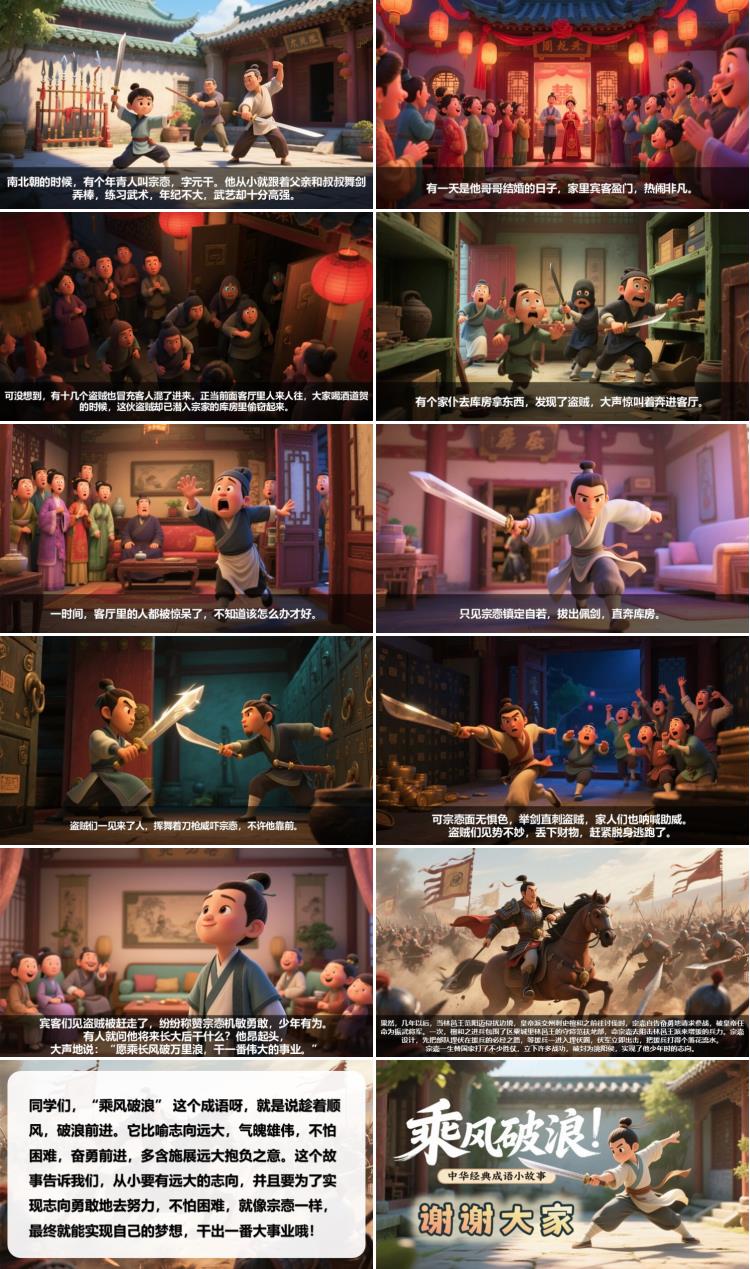 同学们,“乘风破浪” 这个成语呀,就是说趁着顺风,破浪前进。它比喻志向远大,气魄雄伟,不怕困难,奋勇前进,多含施展远大抱负之意。这个故事告诉我们,从小要有远大的志向,并且要为了实现志向勇敢地去努力,不怕困难,就像宗悫一样,最终就能实现自己的梦想,干出一番大事业哦!