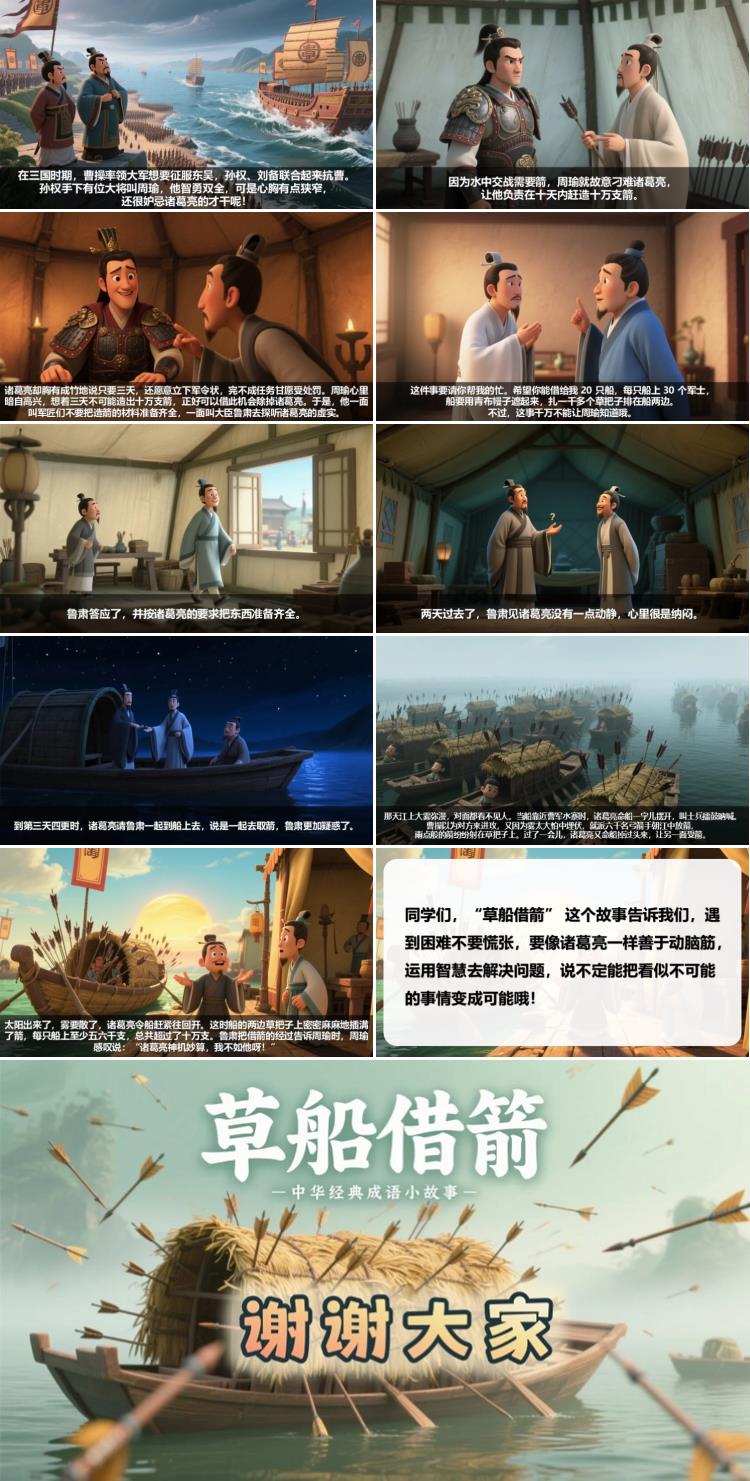 同学们,“草船借箭” 这个故事告诉我们,遇到困难不要慌张,要像诸葛亮一样善于动脑筋,运用智慧去解决问题,说不定能把看似不可能的事情变成可能哦!