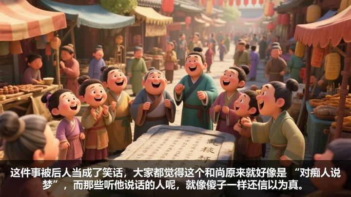 后来呀,这个和尚去世了,有个叫李邕的人要为他作碑文。可是李邕不明白和尚之前说的话是什么意思,就只好根据和尚当年的回答写道:“大师姓何,何国人。” 这件事被后人当成了笑话,大家都觉得这个和尚原来就好像是 “对痴人说梦”,而那些听他说话的人呢,就像傻子一样还信以为真。