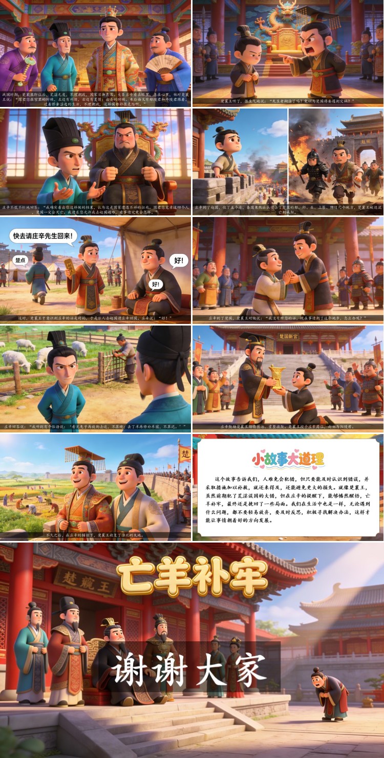 这个故事告诉我们,人难免会犯错,但只要能及时认识到错误,并采取措施加以补救,就还来得及,还能避免更大的损失。就像楚襄王,虽然前期犯了荒淫误国的大错,但在庄辛的提醒下,能够幡然醒悟,亡羊补牢,最终还是挽回了一些局面。我们在生活中也是一样,无论遇到什么问题,都不要轻易放弃,要及时反思,积极寻找解决办法,这样才能让事情朝着好的方向发展。