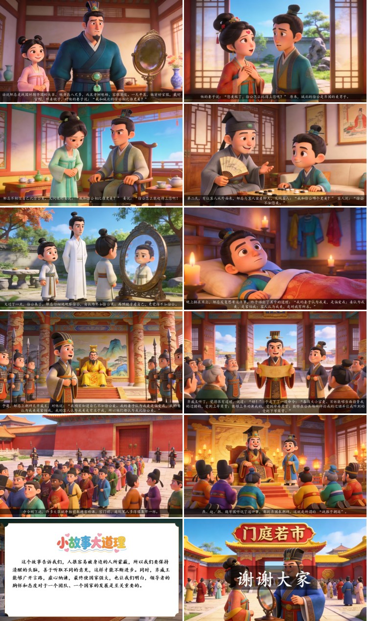 这个故事告诉我们,人很容易被身边的人所蒙蔽,所以我们要保持清醒的头脑,善于听取不同的意见,这样才能不断进步。同时,齐威王能够广开言路,虚心纳谏,最终使国家强大,也让我们明白,领导者的胸怀和态度对于一个团队、一个国家的发展是至关重要的。
