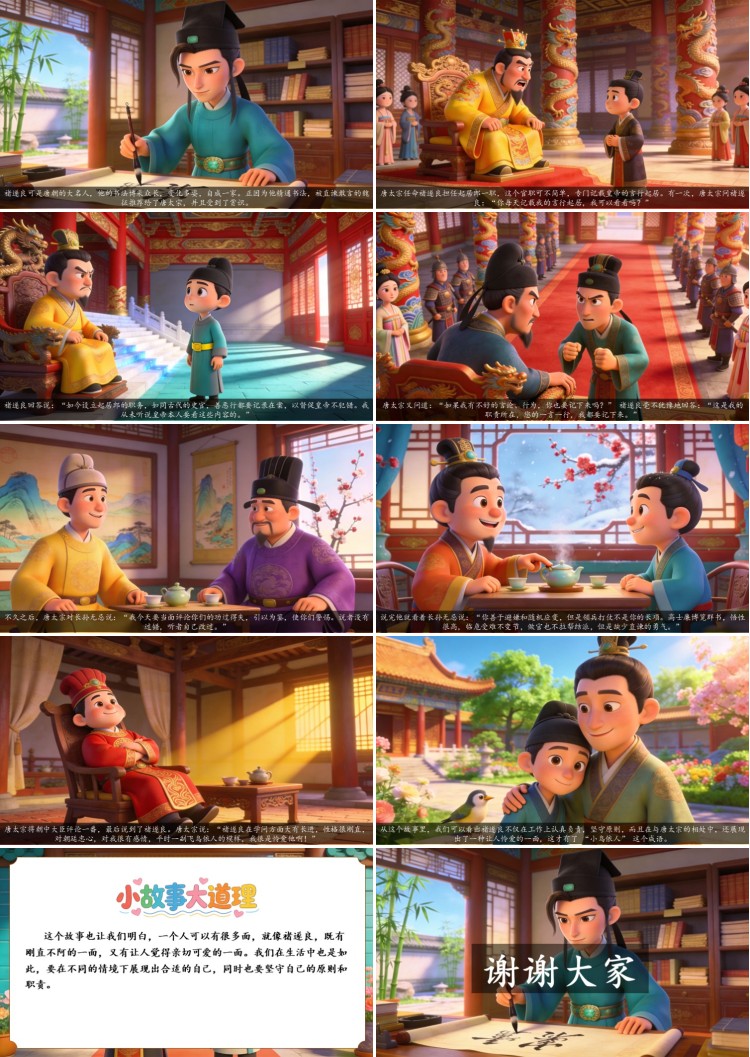 这个故事也让我们明白,一个人可以有很多面,就像褚遂良,既有刚直不阿的一面,又有让人觉得亲切可爱的一面。我们在生活中也是如此,要在不同的情境下展现出合适的自己,同时也要坚守自己的原则和职责。