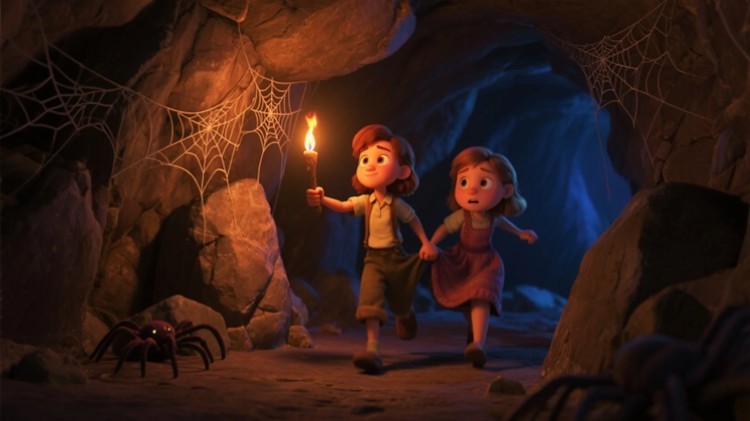 (山洞内,光线昏暗,岩壁上挂着蜘蛛网,安妮举着火把走在前面,贝琪揪着安妮的衣角紧跟其后,脚步有些慌乱)
