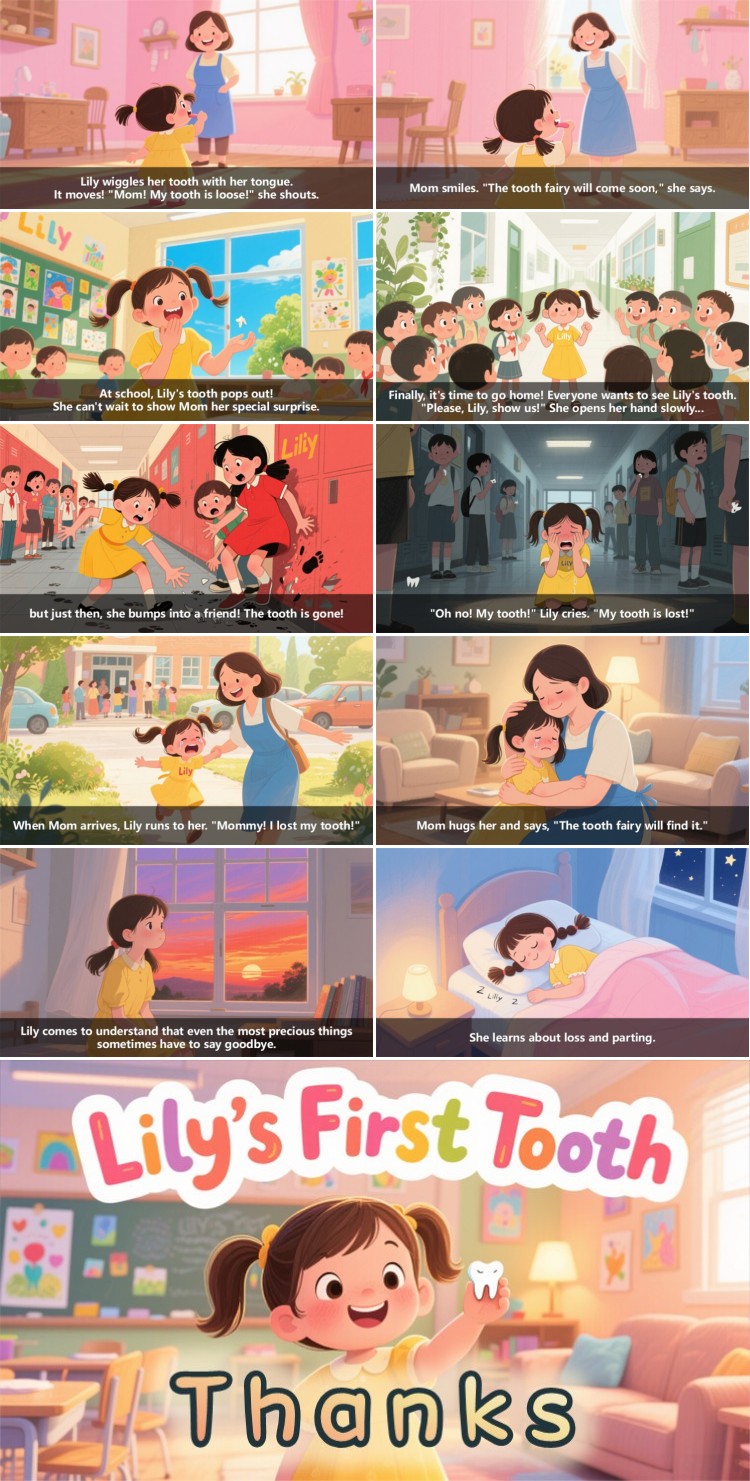 At school, Lily's tooth pops out! She can't wait to show Mom her special surprise.