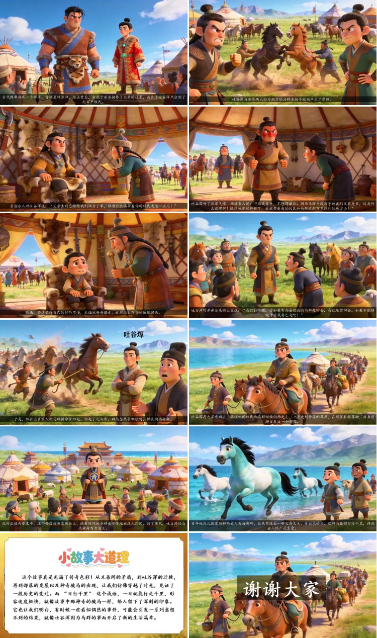 这个故事真是充满了传奇色彩!从兄弟间的矛盾,到吐谷浑的迁徙,再到部落的发展以及神奇骏马的出现,让我们仿佛穿越了时光,见证了一段历史的变迁。而 “日行千里” 这个成语,一日就能行走千里,形容速度极快,就像故事中那神奇的骏马一样,给人留下了深刻的印象。它也让我们明白,有时候一些看似偶然的事件,可能会引发一系列意想不到的结果,就像吐谷浑因为马群的事而开启了新的生活篇章。