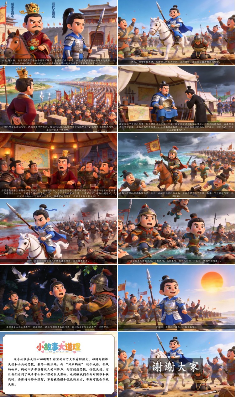这个故事真是惊心动魄啊!苻坚的百万大军看似强大,却因为指挥失误和士兵的恐慌,最终一败涂地。而 “风声鹤唳” 这个成语,把风的响声、鹤的叫声都当作敌人的叫阵声,形容疑惑恐惧,惊慌失措。它让我们看到了战争中士兵心理的巨大影响,也提醒我们在面对困难和挑战时,要保持冷静和理智,不要被恐惧和慌乱所左右,否则可能会导致失败。