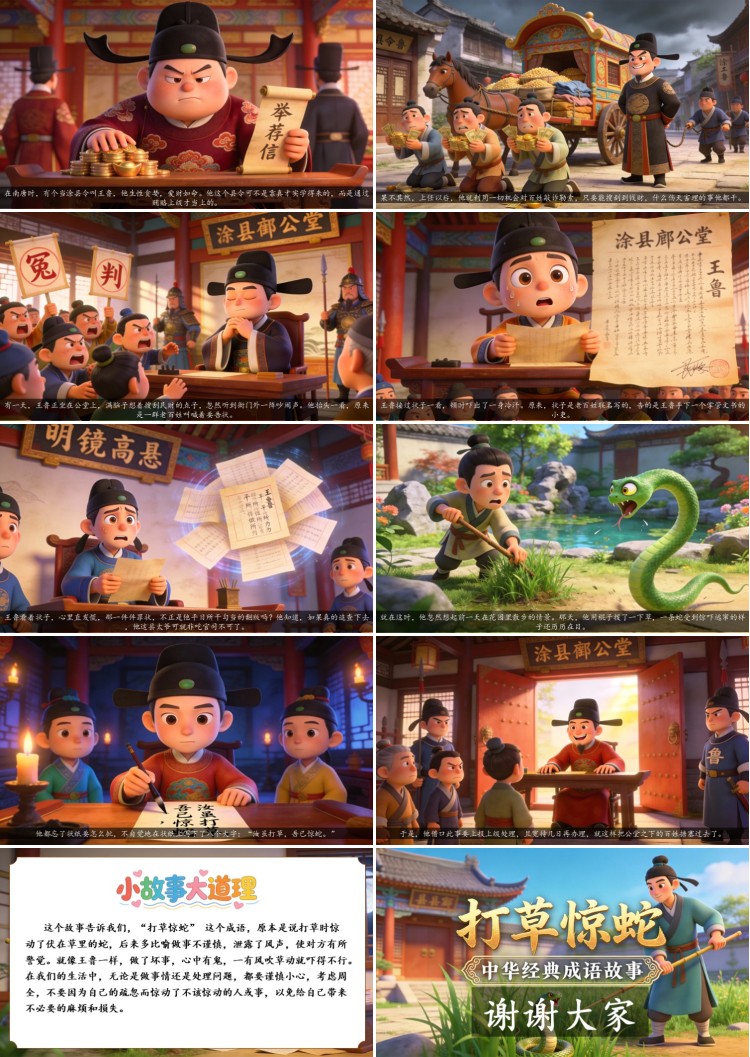 这个故事告诉我们,“打草惊蛇” 这个成语,原本是说打草时惊动了伏在草里的蛇,后来多比喻做事不谨慎,泄露了风声,使对方有所警觉。就像王鲁一样,做了坏事,心中有鬼,一有风吹草动就吓得不行。在我们的生活中,无论是做事情还是处理问题,都要谨慎小心,考虑周全,不要因为自己的疏忽而惊动了不该惊动的人或事,以免给自己带来不必要的麻烦和损失。