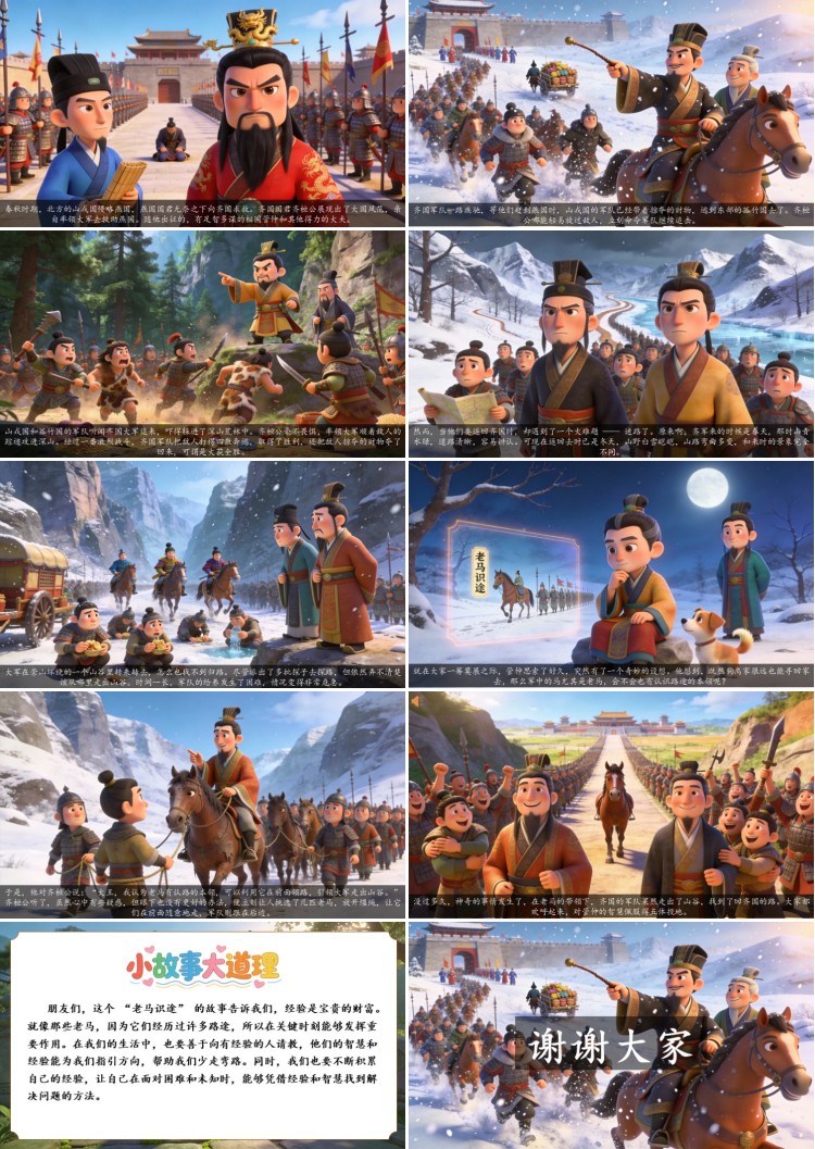 朋友们,这个 “老马识途” 的故事告诉我们,经验是宝贵的财富。就像那些老马,因为它们经历过许多路途,所以在关键时刻能够发挥重要作用。在我们的生活中,也要善于向有经验的人请教,他们的智慧和经验能为我们指引方向,帮助我们少走弯路。同时,我们也要不断积累自己的经验,让自己在面对困难和未知时,能够凭借经验和智慧找到解决问题的方法。