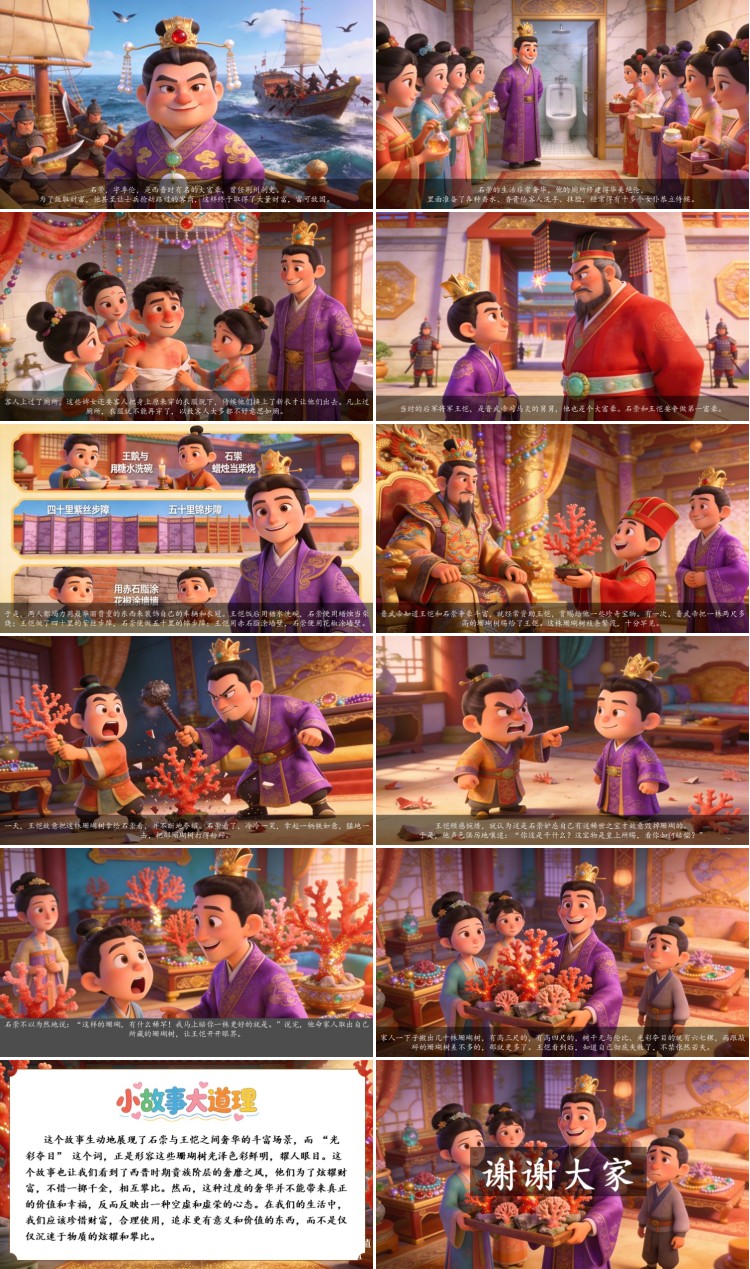 这个故事生动地展现了石崇与王恺之间奢华的斗富场景,而 “光彩夺目” 这个词,正是形容这些珊瑚树光泽色彩鲜明,耀人眼目。这个故事也让我们看到了西晋时期贵族阶层的奢靡之风,他们为了炫耀财富,不惜一掷千金,相互攀比。然而,这种过度的奢华并不能带来真正的价值和幸福,反而反映出一种空虚和虚荣的心态。在我们的生活中,我们应该珍惜财富,合理使用,追求更有意义和价值的东西,而不是仅仅沉迷于物质的炫耀和攀比。