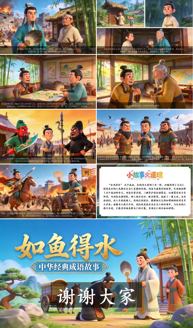 “如鱼得水” 这个成语,如同鱼儿得到了水一样,比喻得到了与自己情投意合的人或很适合自己发展的环境。刘备与诸葛亮的故事,生动地诠释了这个成语的含义。刘备求贤若渴,三顾茅庐请出诸葛亮,而诸葛亮也不负所望,为刘备出谋划策,两人相互信任、配合默契,成就了一番大业。这告诉我们,在人生的道路上,找到志同道合、能够相互支持和帮助的伙伴是多么重要。就像鱼儿离不开水,我们也需要在适合自己的环境中,与合适的人携手共进,才能更好地发挥自己的才能,实现自己的目标和理想。