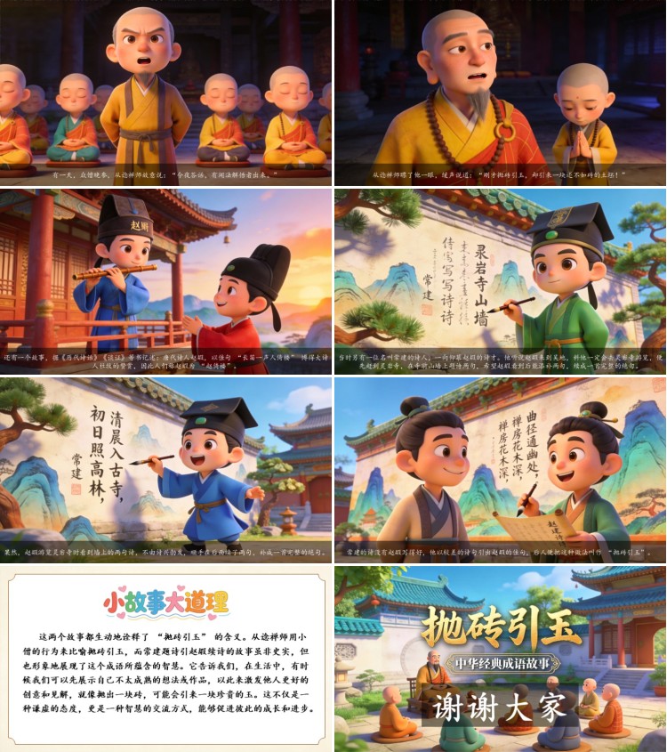 这两个故事都生动地诠释了 “抛砖引玉” 的含义。从谂禅师用小僧的行为来比喻抛砖引玉,而常建题诗引赵嘏续诗的故事虽非史实,但也形象地展现了这个成语所蕴含的智慧。它告诉我们,在生活中,有时候我们可以先展示自己不太成熟的想法或作品,以此来激发他人更好的创意和见解,就像抛出一块砖,可能会引来一块珍贵的玉。这不仅是一种谦虚的态度,更是一种智慧的交流方式,能够促进彼此的成长和进步。
