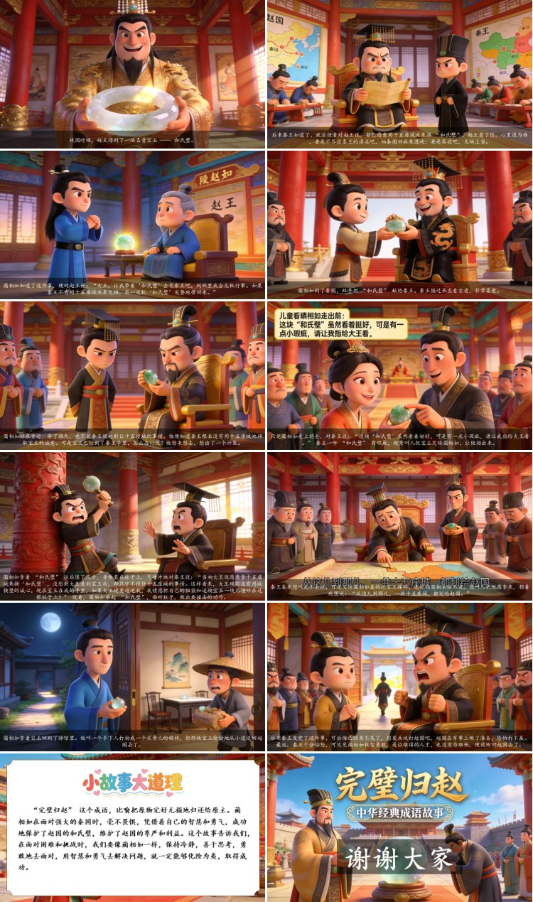 “完璧归赵” 这个成语,比喻把原物完好无损地归还给原主。蔺相如在面对强大的秦国时,毫不畏惧,凭借着自己的智慧和勇气,成功地保护了赵国的和氏璧,维护了赵国的尊严和利益。这个故事告诉我们,在面对困难和挑战时,我们要像蔺相如一样,保持冷静,善于思考,勇敢地去面对,用智慧和勇气去解决问题,就一定能够化险为夷,取得成功。