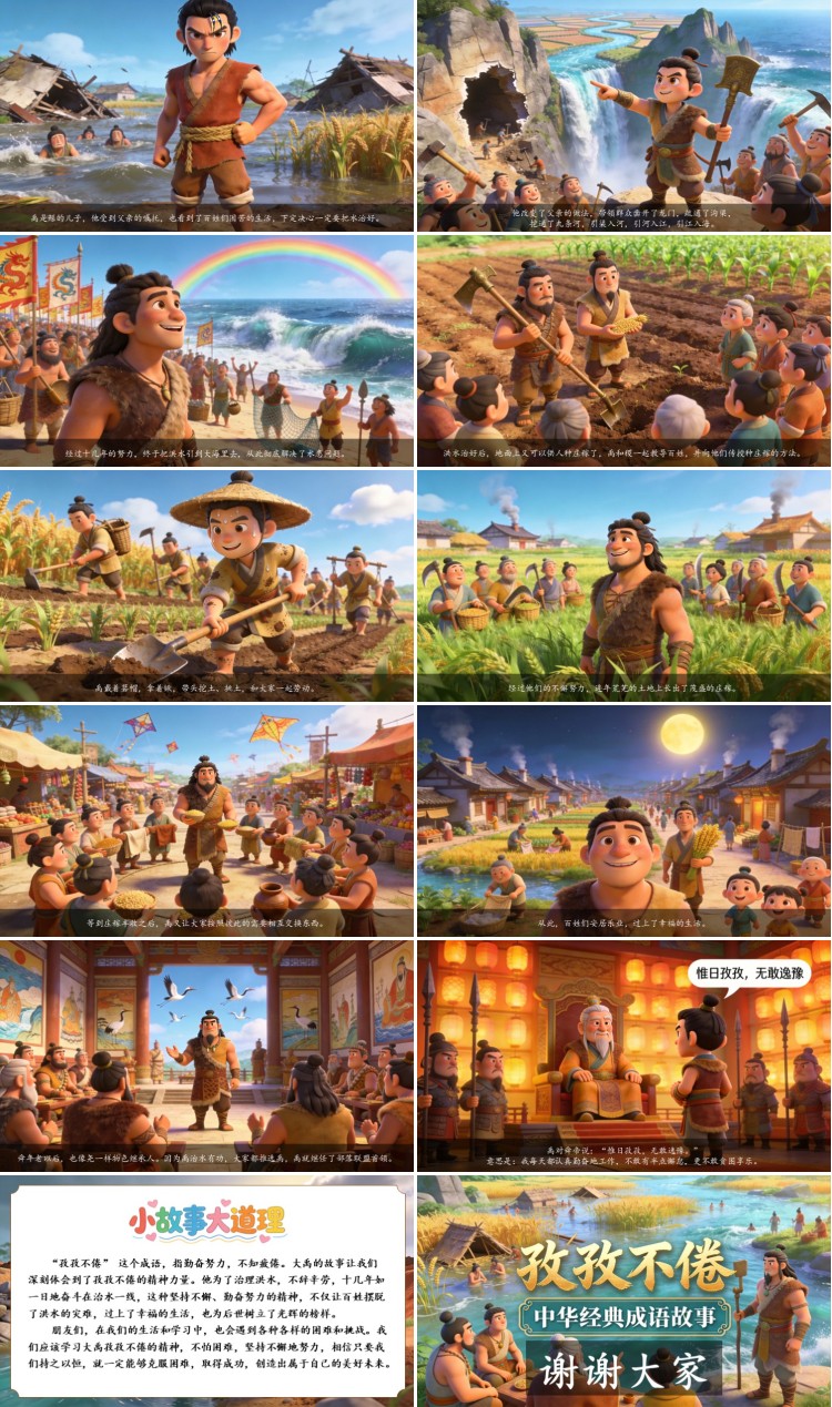 “孜孜不倦” 这个成语,指勤奋努力,不知疲倦。大禹的故事让我们深刻体会到了孜孜不倦的精神力量。他为了治理洪水,不辞辛劳,十几年如一日地奋斗在治水一线,这种坚持不懈、勤奋努力的精神,不仅让百姓摆脱了洪水的灾难,过上了幸福的生活,也为后世树立了光辉的榜样。