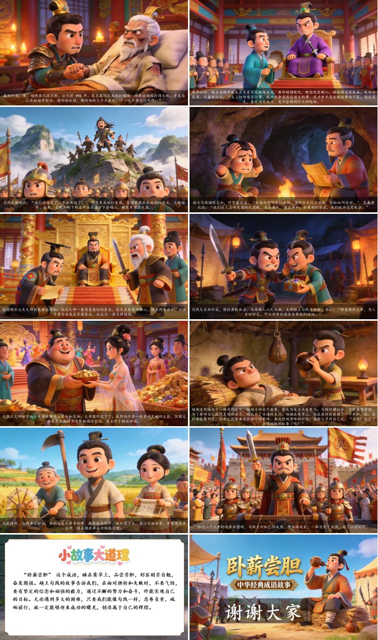 “卧薪尝胆” 这个成语,睡在柴草上,品尝苦胆,形容刻苦自勉,奋发图强。越王勾践的故事告诉我们,在面对挫折和失败时,不要气馁,要有坚定的信念和顽强的毅力,通过不懈的努力和奋斗,终能实现自己的目标。无论遇到多大的困难,只要我们能像勾践一样,忍辱负重,砥砺前行,就一定能够迎来成功的曙光,创造属于自己的辉煌。
