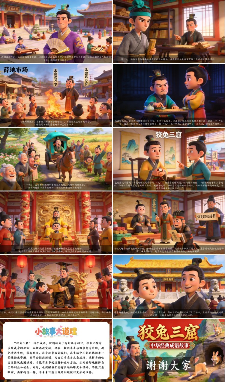 “狡兔三窟” 这个成语,狡猾的兔子有好几个洞穴,原来比喻有多处藏身的地方,以便逃避灾祸,现在一般用来表示做事留有余地,避免遭遇失败,带有贬义。这个故事告诉我们,在生活中不能只依赖单一的途径或资源,要学会提前规划,为自己多准备几条后路,这样当面临突发情况或困境时,才能有更多的选择和应对方法,从而更好地保障自己的利益和安全。同时,也提醒我们要有长远的眼光和谋略,不能只看眼前,要像冯谖一样,为未来可能出现的问题做好充分的准备。