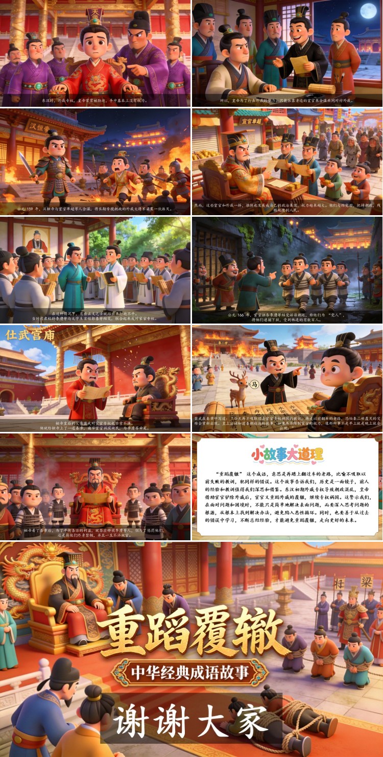 “重蹈覆辙” 这个成语,意思是再踏上翻过车的老路,比喻不吸取以前失败的教训,犯同样的错误。这个故事告诉我们,历史是一面镜子,前人的经验和教训值得我们深思和借鉴。东汉初期外戚专权导致朝政混乱,皇帝借助宦官铲除外戚后,宦官又重蹈外戚的覆辙,继续专权祸国。这警示我们,在面对问题和困境时,不能只是简单地解决表面问题,而要深入思考问题的根源,从根本上找到解决办法,避免陷入恶性循环。同时,也要善于从过去的错误中学习,不断总结经验,才能避免重蹈覆辙,走向更好的未来。