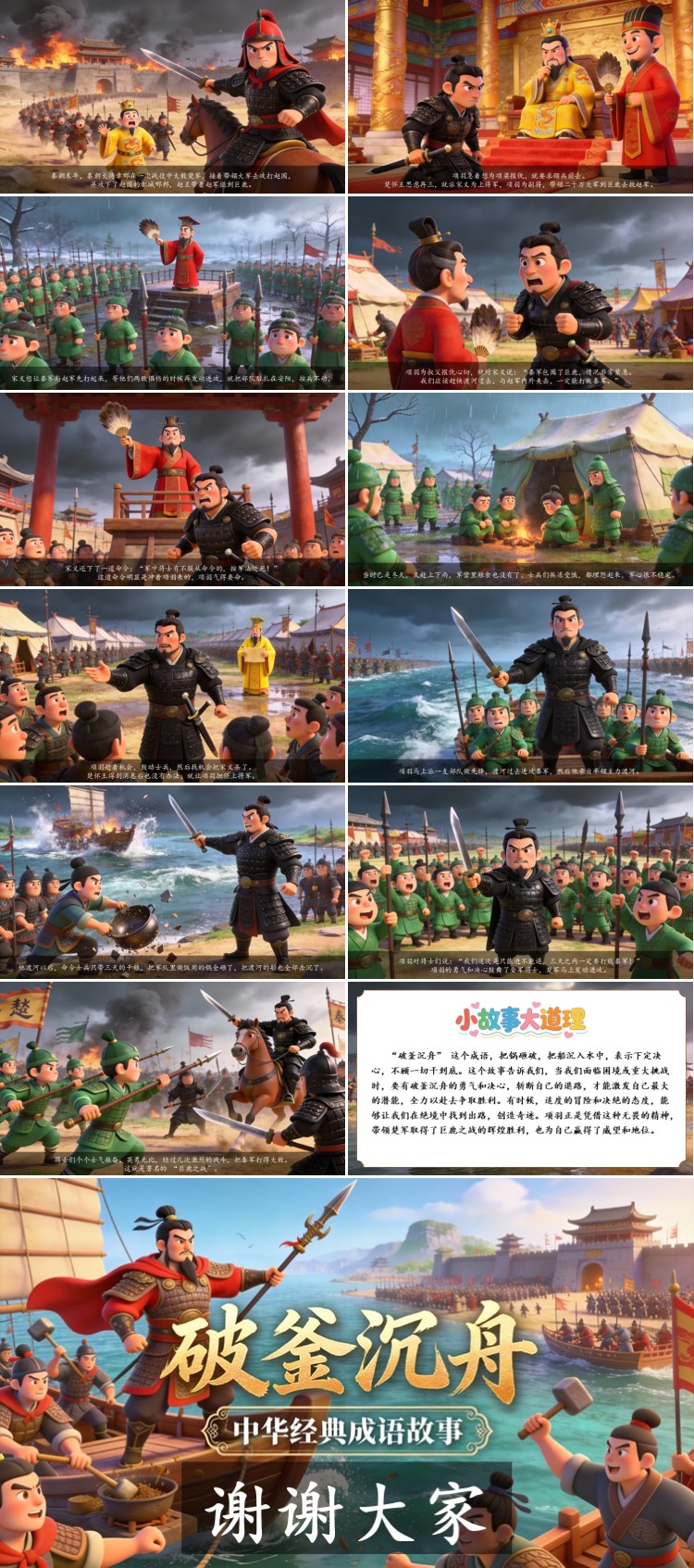 “破釜沉舟” 这个成语,把锅砸破,把船沉入水中,表示下定决心,不顾一切干到底。这个故事告诉我们,当我们面临困境或重大挑战时,要有破釜沉舟的勇气和决心,斩断自己的退路,才能激发自己最大的潜能,全力以赴去争取胜利。有时候,适度的冒险和决绝的态度,能够让我们在绝境中找到出路,创造奇迹。项羽正是凭借这种无畏的精神,带领楚军取得了巨鹿之战的辉煌胜利,也为自己赢得了威望和地位。