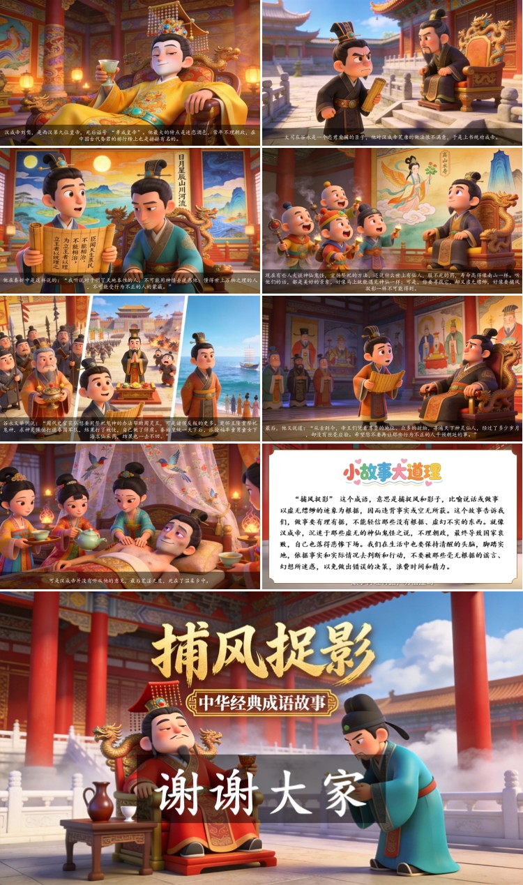 “捕风捉影” 这个成语,意思是捕捉风和影子,比喻说话或做事以虚无缥缈的迹象为根据,因而违背事实或空无所获。这个故事告诉我们,做事要有理有据,不能轻信那些没有根据、虚幻不实的东西。就像汉成帝,沉迷于那些虚无的神仙鬼怪之说,不理朝政,最终导致国家衰败,自己也落得悲惨下场。我们在生活中也要保持清醒的头脑,脚踏实地,依据事实和实际情况去判断和行动,不要被那些毫无根据的谣言、幻想所迷惑,以免做出错误的决策,浪费时间和精力。