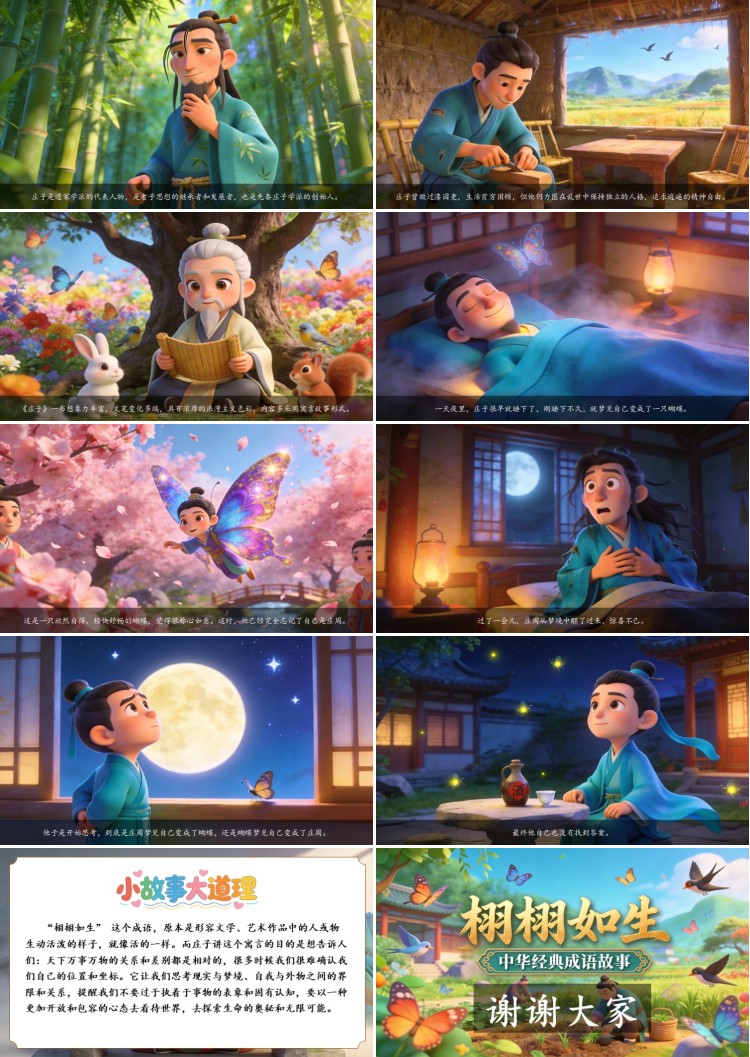 “栩栩如生” 这个成语,原本是形容文学、艺术作品中的人或物生动活泼的样子,就像活的一样。而庄子讲这个寓言的目的是想告诉人们:天下万事万物的关系和差别都是相对的,很多时候我们很难确认我们自己的位置和坐标。它让我们思考现实与梦境、自我与外物之间的界限和关系,提醒我们不要过于执着于事物的表象和固有认知,要以一种更加开放和包容的心态去看待世界,去探索生命的奥秘和无限可能。