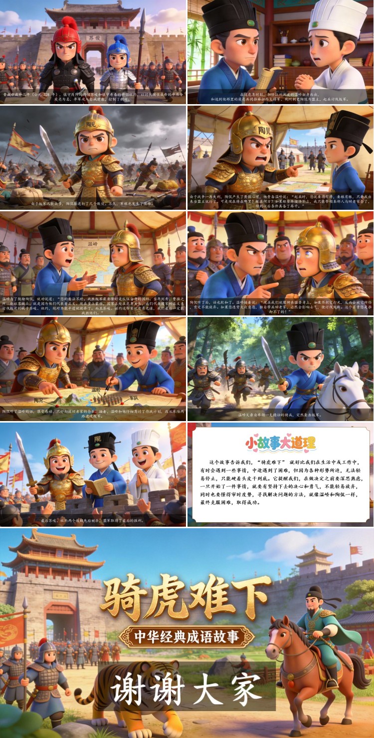 这个故事告诉我们,“骑虎难下” 就好比我们在生活中或工作中,有时会遇到一些事情,中途遇到了困难,但因为各种形势所迫,无法轻易停止,只能硬着头皮干到底。它提醒我们,在做决定之前要深思熟虑,一旦开始了一件事情,就要有坚持下去的决心和勇气,不能轻易放弃,同时也要懂得审时度势,寻找解决问题的方法,就像温峤和陶侃一样,最终克服困难,取得成功。