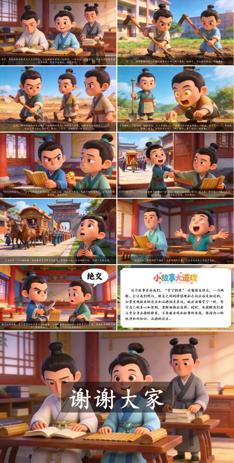 这个故事告诉我们,“管宁割席” 比喻朋友绝交,一刀两断。它让我们明白,朋友之间的价值观和志向应该是相近的,如果发现彼此的追求和品德相差甚远,就应该像管宁一样,坚守自己的本心和原则,果断地做出选择。同时,也提醒我们要注重自身品德的修养,不要被金钱和权势所迷惑,保持内心的纯净和对知识、品德的追求。