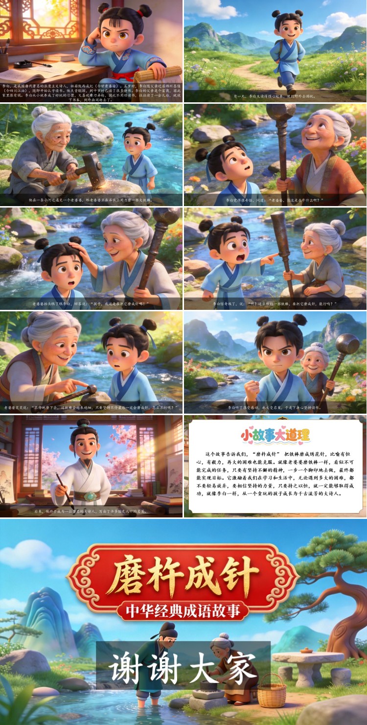 这个故事告诉我们,“磨杵成针” 把铁棒磨成绣花针,比喻有恒心,有毅力,再大的困难也能克服。就像老婆婆磨铁棒一样,看似不可能完成的任务,只要有坚持不懈的精神,一步一个脚印地去做,最终都能实现目标。它激励着我们在学习和生活中,无论遇到多大的困难,都不要轻易放弃,要相信坚持的力量,只要持之以恒,就一定能够取得成功,就像李白一样,从一个贪玩的孩子成长为千古流芳的大诗人。